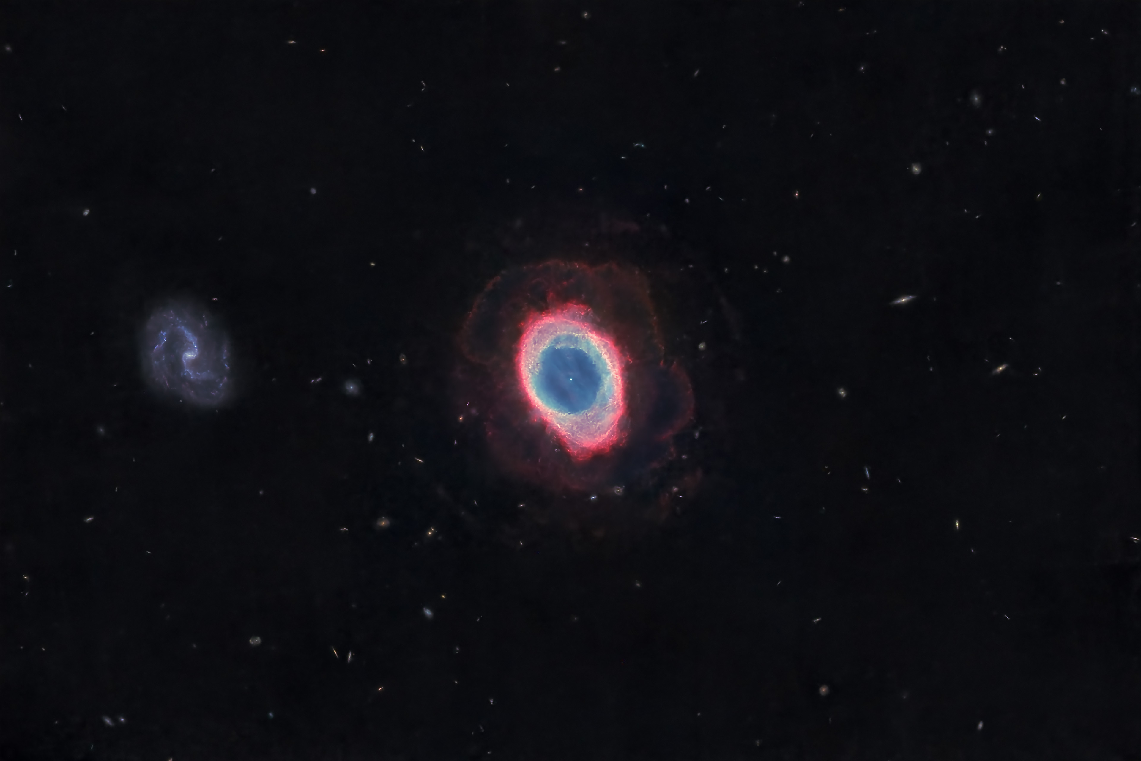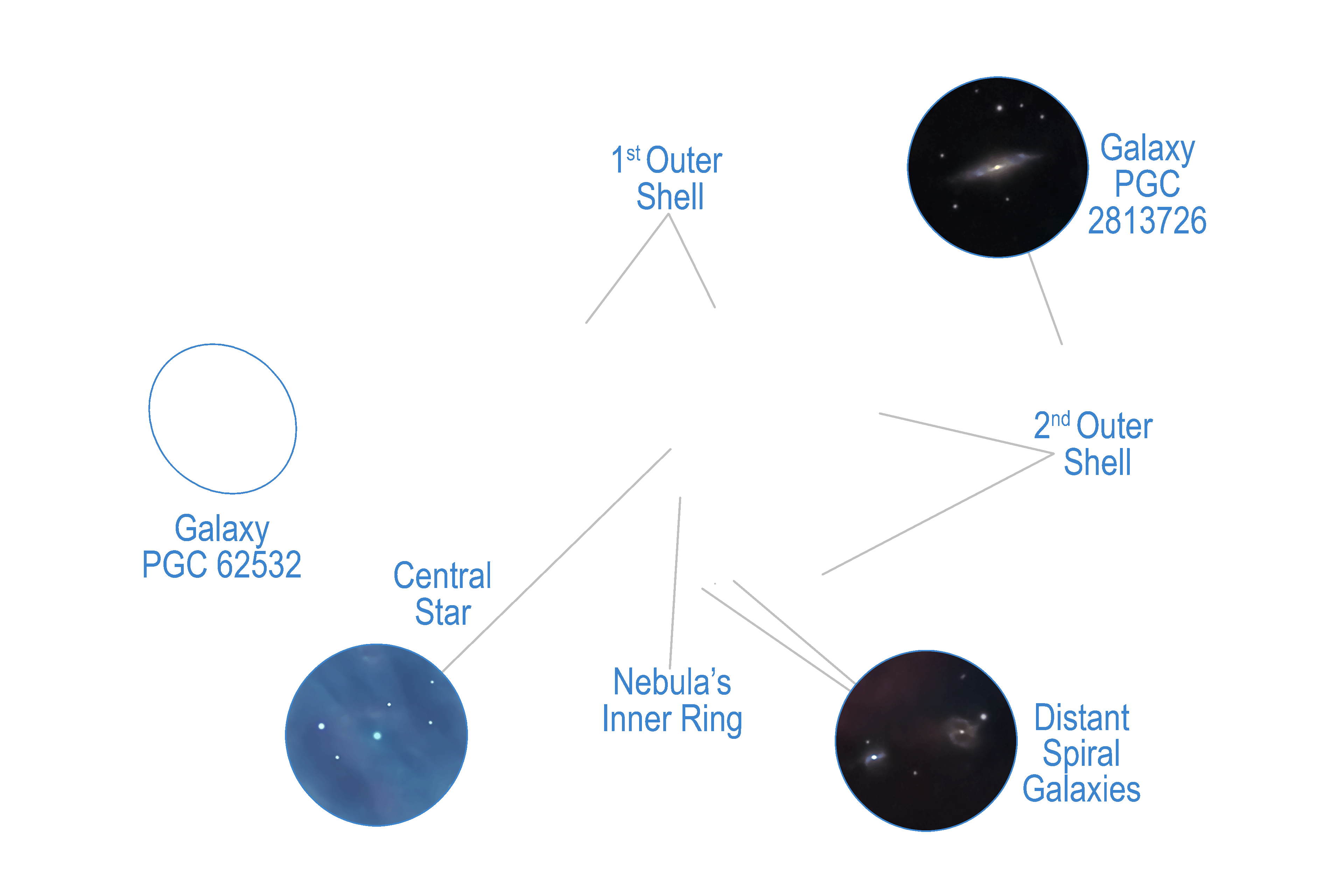 as annotated next to the insets. Two galaxies are even visible through the outer shells of M57.